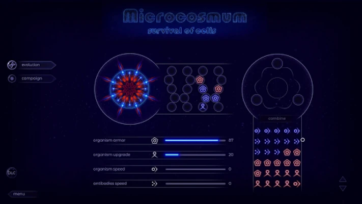 The evolution of beings in the Microcosmum has an important role to play. Your little creatures will improve with the help of genes. Genes increase the armor, speed, attack of spores and other characteristics of microorganisms so that in the microcosm no bacteria or virus can defeat your microorganisms. Insert genes into the DNA of your organisms or combine genes to increase their level.
